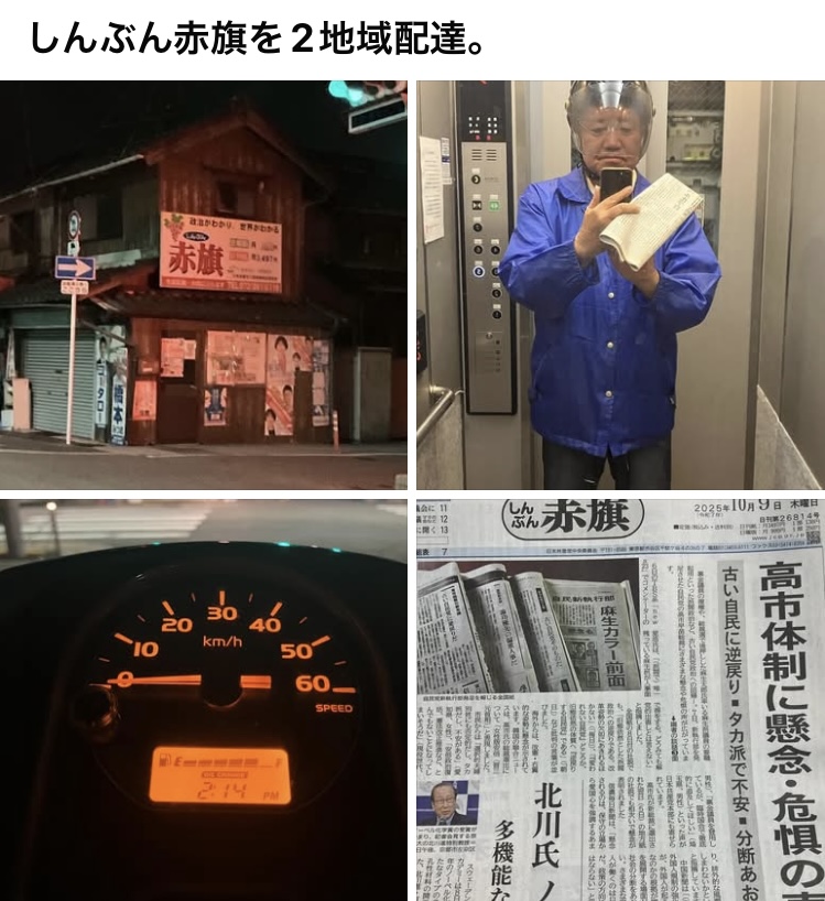 12時から八尾の地区委員会に行ってしんぶん赤旗の配達の日曜版を取りに行き、大県事務所と本郷事務所におろす。