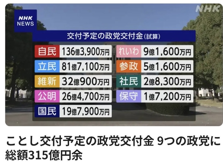 国会議員50人削減で35億円 政党助成金が310億円 維新の会は32億円受け取る