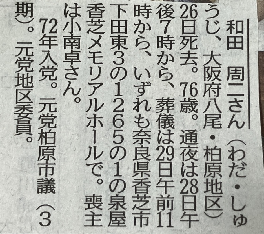 癌療養中と聞いたので7月に江村じゅん議員と香芝のご自宅に行きましたが、病院入院中で留守で電話でお話をしました。