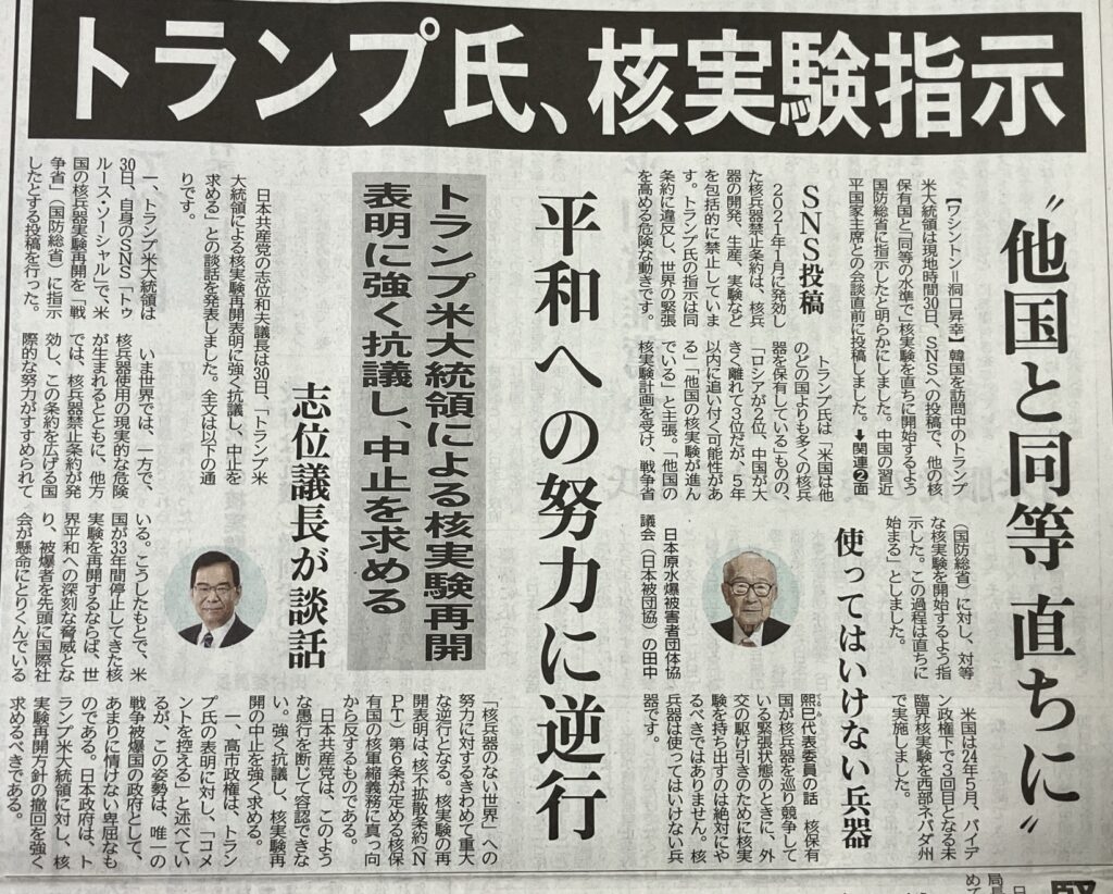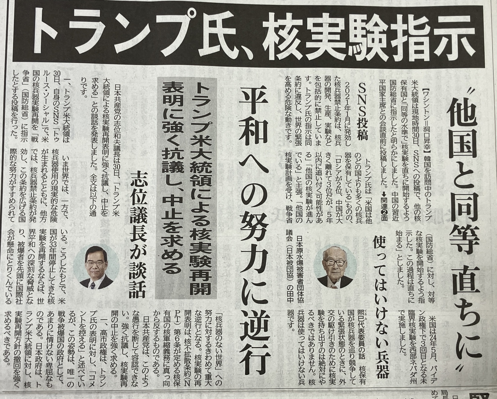 平和への努力に逆行/トランプ米大統領による核実験再開表明に強く抗議し、中止を求める/志位議長が談話