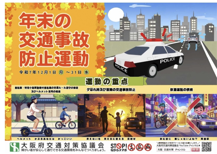 年末にかけて飲酒の機会が増え、飲酒運転による交通事故が多発する傾向にあります。さらに、この時期、日没が早く、日の出も遅いことから夕暮れ、夜間、明け方の交通事故の増加も懸念されます。市民一人一人が交通ルールの遵守と正しい交通マナーの実践を習慣付けることによって、交通事故防止の徹底を図ることを目的とします。