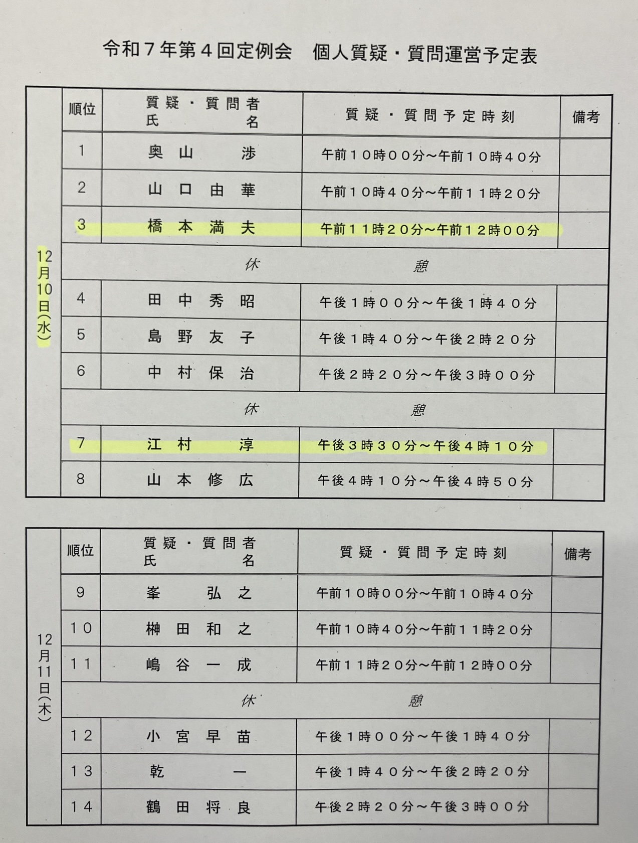 江村じゅん議員は、7番で午後3時30分~4時10分に決まりました。