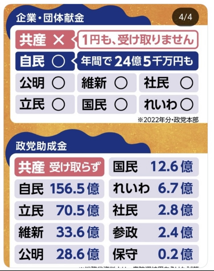 日本共産党は、企業団体献金と政党助成金を受け取っていません。