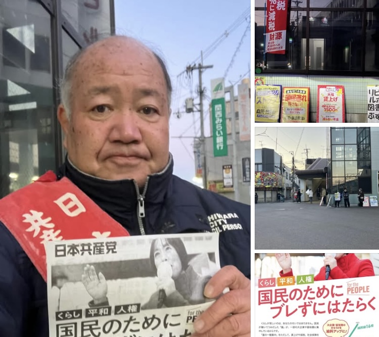 知事選挙が始まったので音(ハンドマイク)なしで、赤旗号外としんぶん赤旗日曜版の見本誌を配布を行いました。