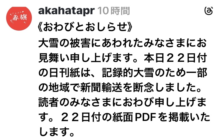 大雪の被害にあわれたみなさまにお見舞い申し上げます。本日22日付の日刊紙は、記録的大雪のため一部の地域で新聞輸送を断念しました。読者のみなさまにおわび申し上げます。22日付の紙面PDFを掲載いたします。