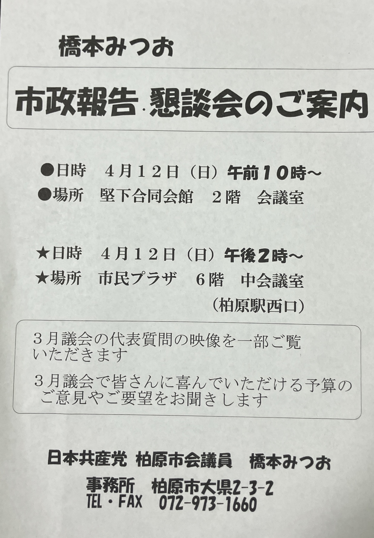 12日(日)市政報告・懇談会のご案内