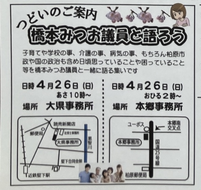 子育てや学校の事、介護の事、病気の事、もちろん柏原市政や国の政治も含め日頃思っていることや困っていること等を橋本みつお議員と一緒に語る集いです。