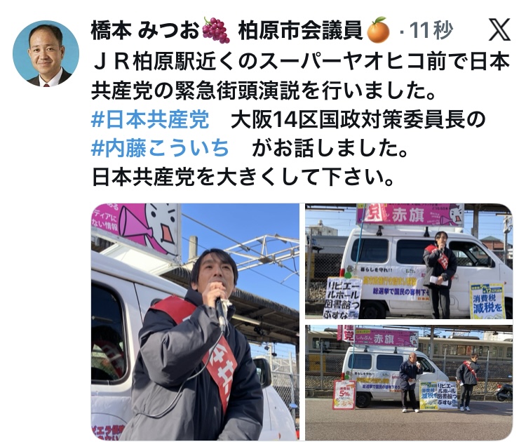 午前は、ヤオヒコ前で内藤こういち大阪14区国政対策委員長と緊急の街頭演説を行いました。