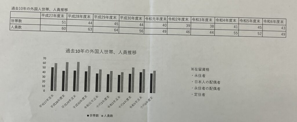 柏原市の10年間の外国人人口と生活保護者の資料をいただきました。