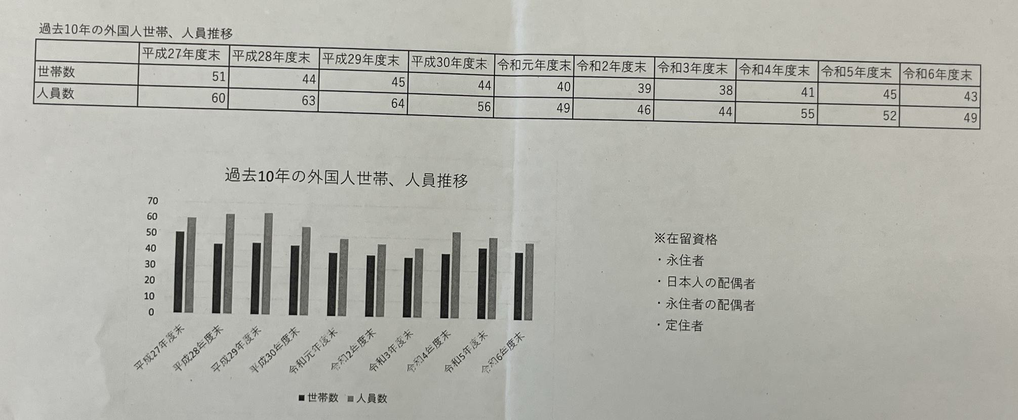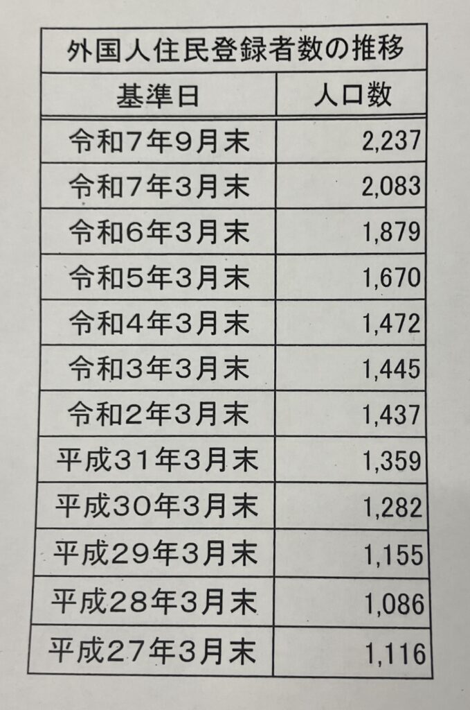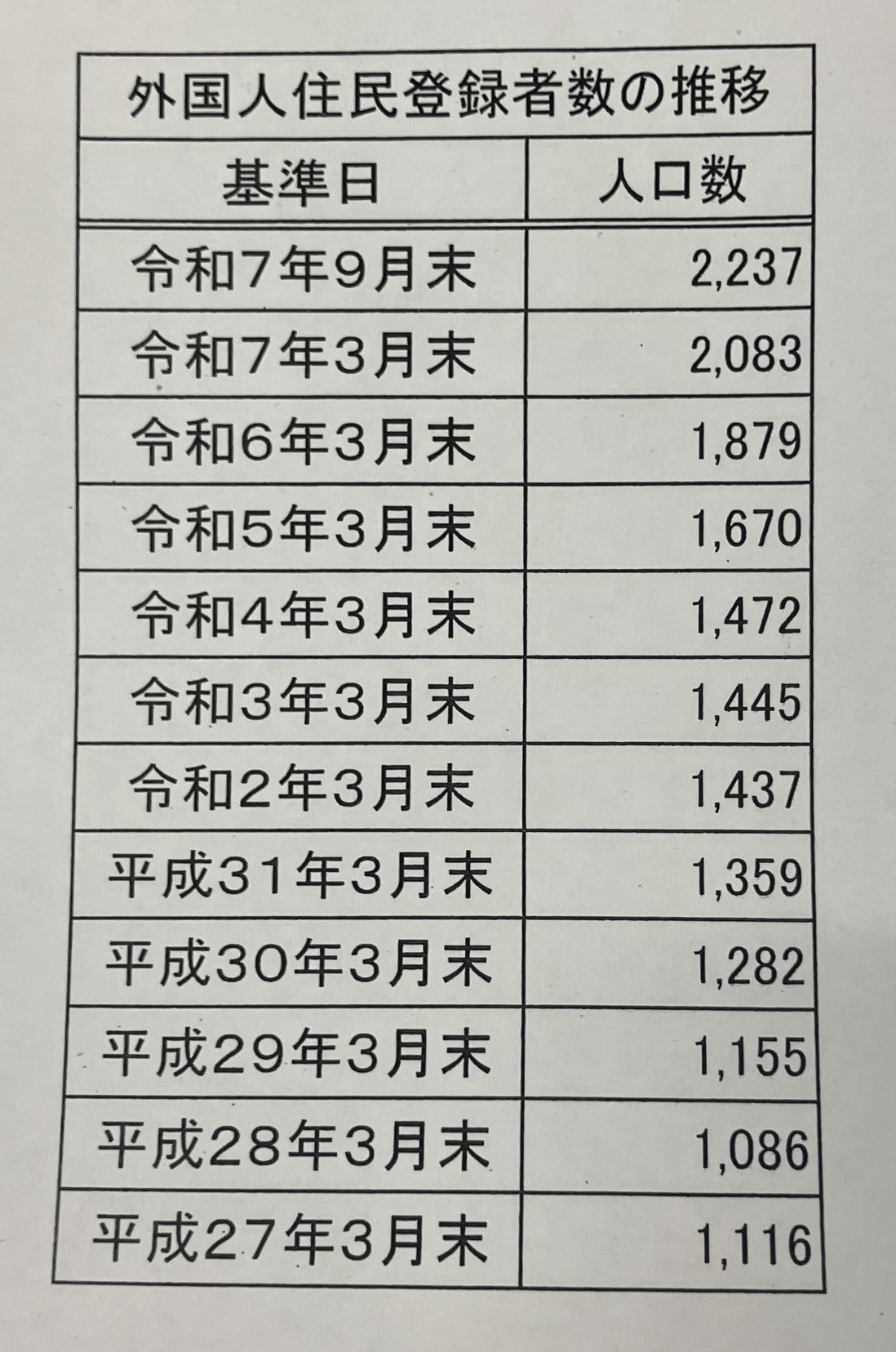 江村じゅん議員の一般質問で明らかになりましたが、外国人在住者は令和7年9月30日現在、柏原市では、41か国2237人。