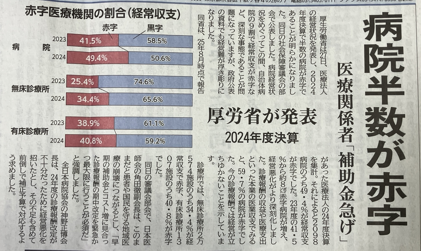 病院半数が赤字/医療関係者「補助金急げ」/厚労省が発表/2024年度決算