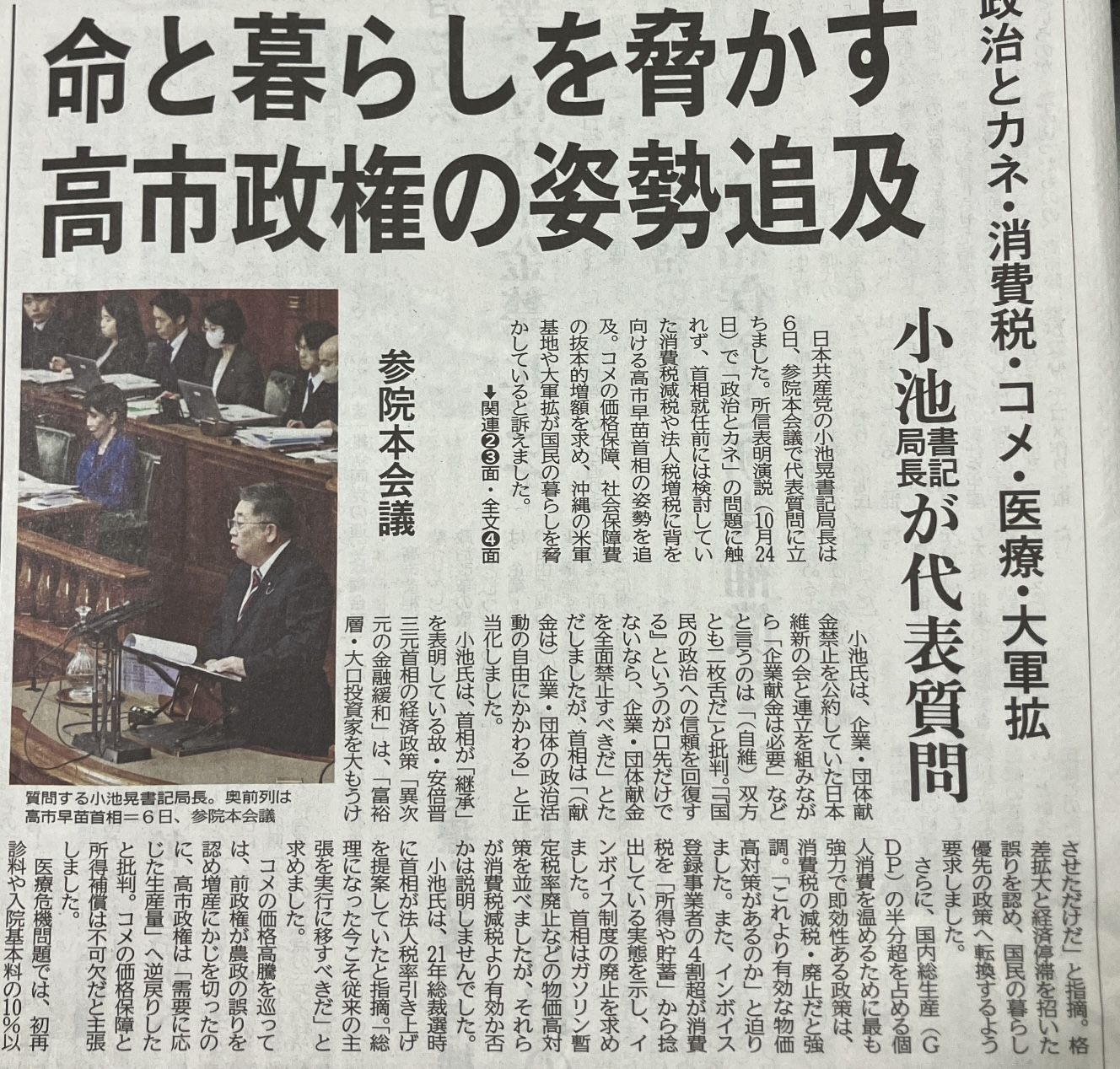 日本共産党の小池晃です。会派を代表して、高市早苗首相に質問します。