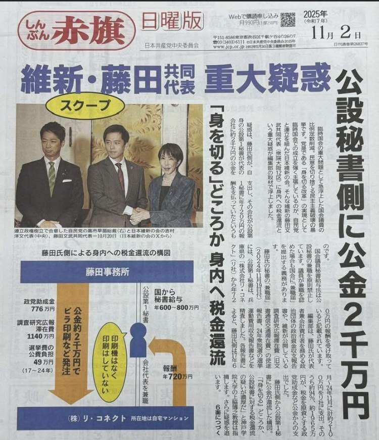 「企業・団体献金の禁止」を公約していた維新の会と連立を組みながら、「企業献金は必要なもの」などと言うのは、双方ともに典型的な二枚舌ではありませんか。