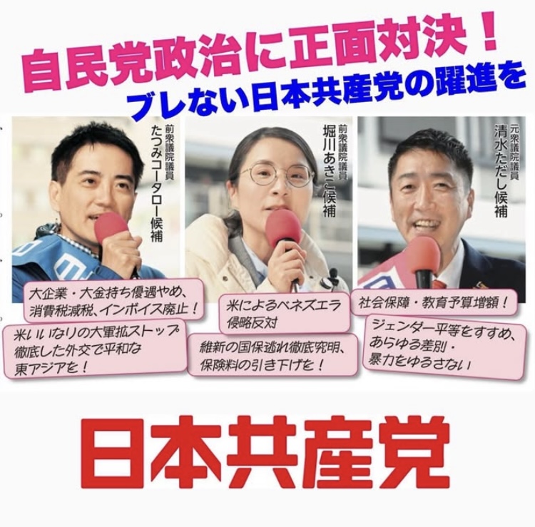 多くの方が、日本共産党と書いていただくことで「たつみコータロー」「堀川あきこ」「清水ただし」が当選できます。