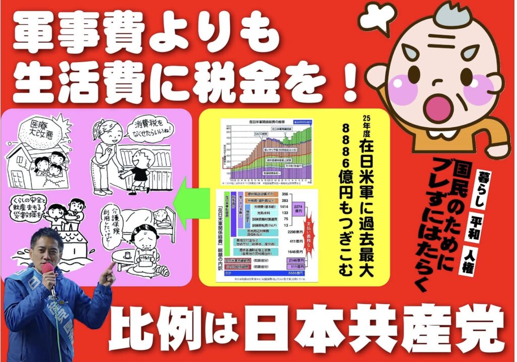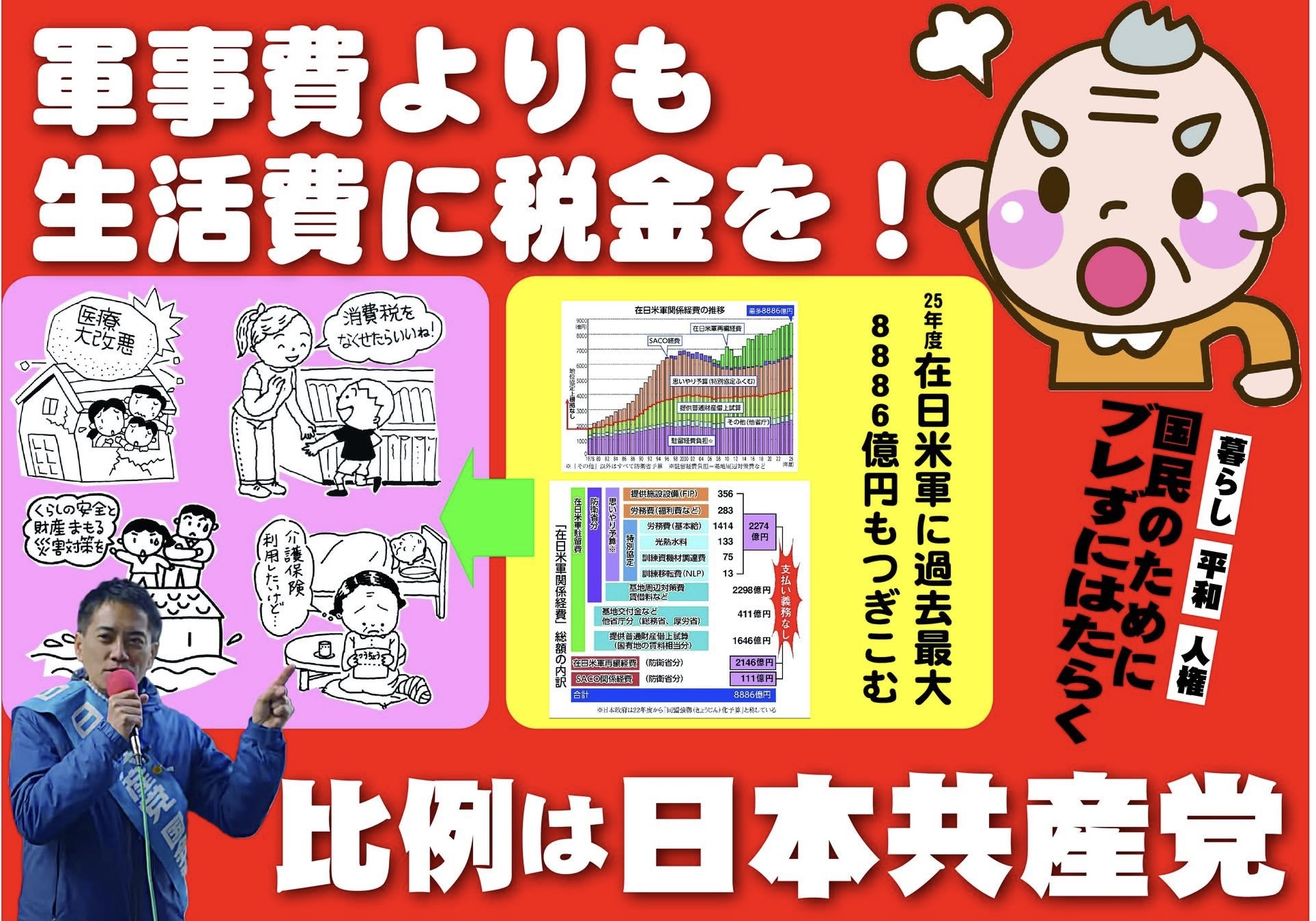 第二に、「こんなアメリカいいなりをいつまで続けるのか」を厳しく問い、憲法9条にもとづく外交の力で平和をつくる日本共産党の対案を掲げています。 米国トランプ政権はベネズエラ侵略をはじめ、国連憲章・国際法などお構いなし、「米国第一」で世界の平和秩序を破壊する帝国主義的野望をむき出しにしています。そんなトランプ大統領に付き従い、「日米同盟絶対」で進められている空前の大軍拡がどんなに危険なものであるかを明らかにし、断固反対を貫きます。