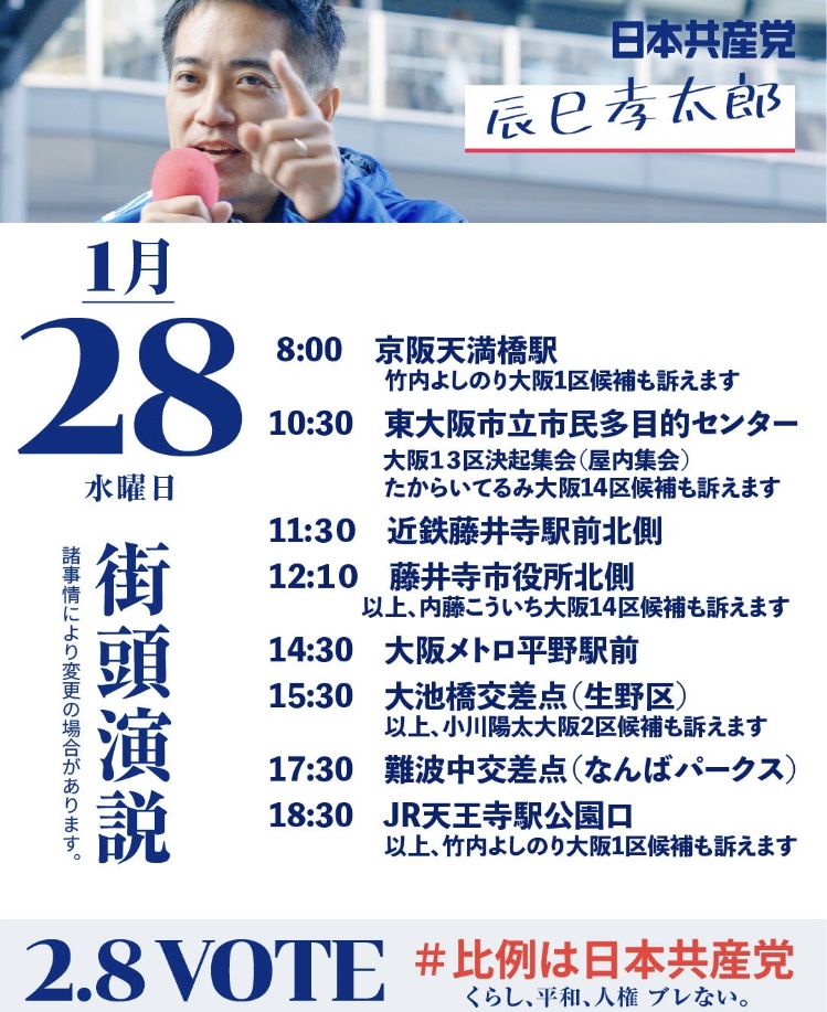なお、大阪府知事選は、都構想は二度にわたる住民投票で否決され、大阪市民は大阪市の存続を選択しており、吉村氏自身も「再挑戦することはない」と述べていた決着済みの問題である。いつまでも破綻した「都構想」にしがみつき、“何度でも勝つまでジャンケン”とは、大阪市民を愚弄するものである。 わが党は、1ミリの道理もない党利党略の “維新の維新による維新のための選挙”を許さず、総選挙で高市自民党もろとも厳しい審判をくだすために、全力をあげる。立場から候補者は擁立いたしません。 (党大阪府委員会)