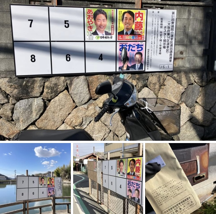起きてから公営掲示板が設置された山間部へ後援会ニュース届けと内藤こういちのポスター貼りを行いました。