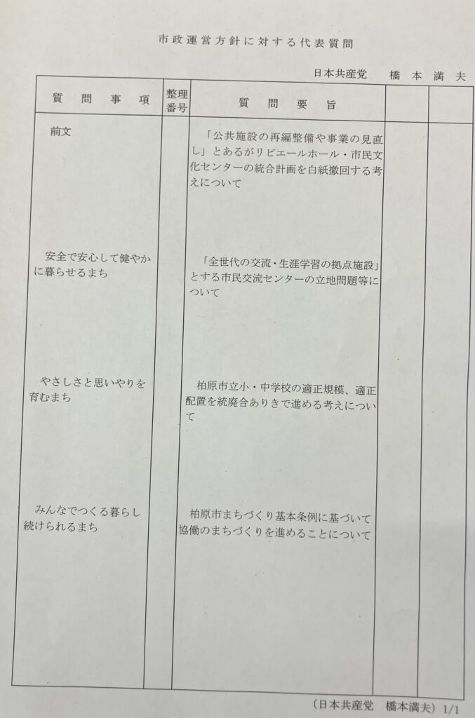 朝1番(正午が締め切り)で議会事務局に冨宅市長の市政運営方針の質問通告用紙を提出しました。