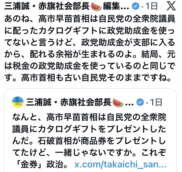 自民315議員にカタログギフト/1人約3万円 高市首相認める/参院本会議/計1千万円 金権体質根深く
