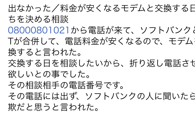通信事業者を名乗る者から「支払いが滞っています。携帯電話がとまります」等の特殊詐欺に発展する可能性が高い不審な電話がかかってきたもの。